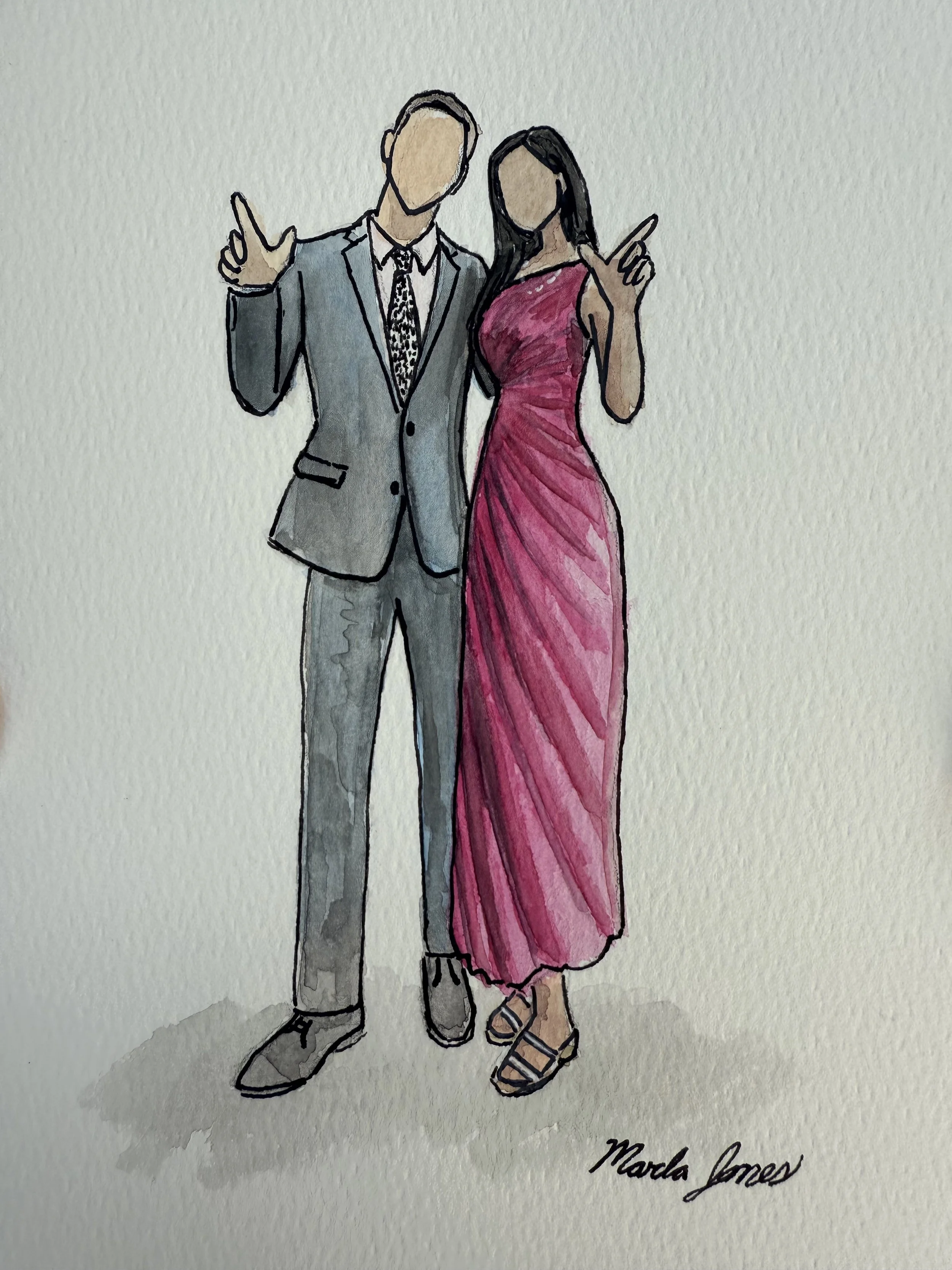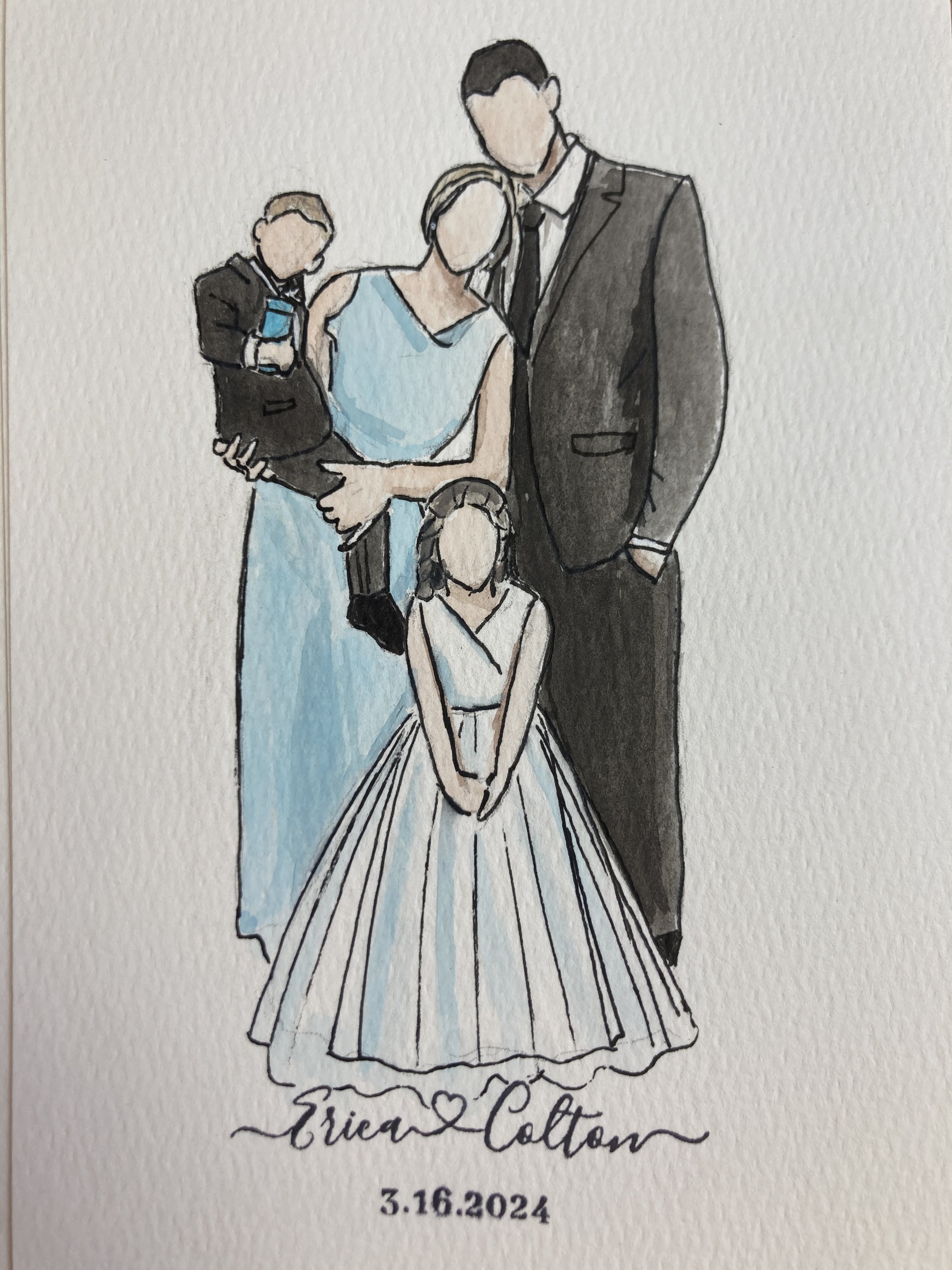 3 Hours on site, 5”x 7” watercolor paper * As many detail drawings as possible of guests * For Events up to 100 guests * Unfinished portraits will be completed in studio and mailed directly to guest * Option to stamp Bride & Groom’s name or wedding date on each guest portrait